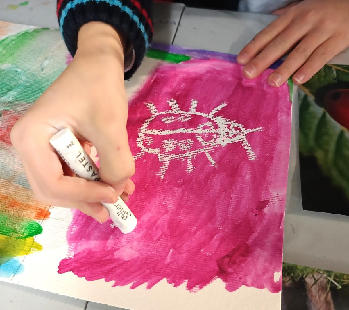 Partindo de folhas brancas, as crianças e jovens deverão criar desenhos com pastel de óleo branco, não vendo ao certo, no momento, o resultado da sua criação.