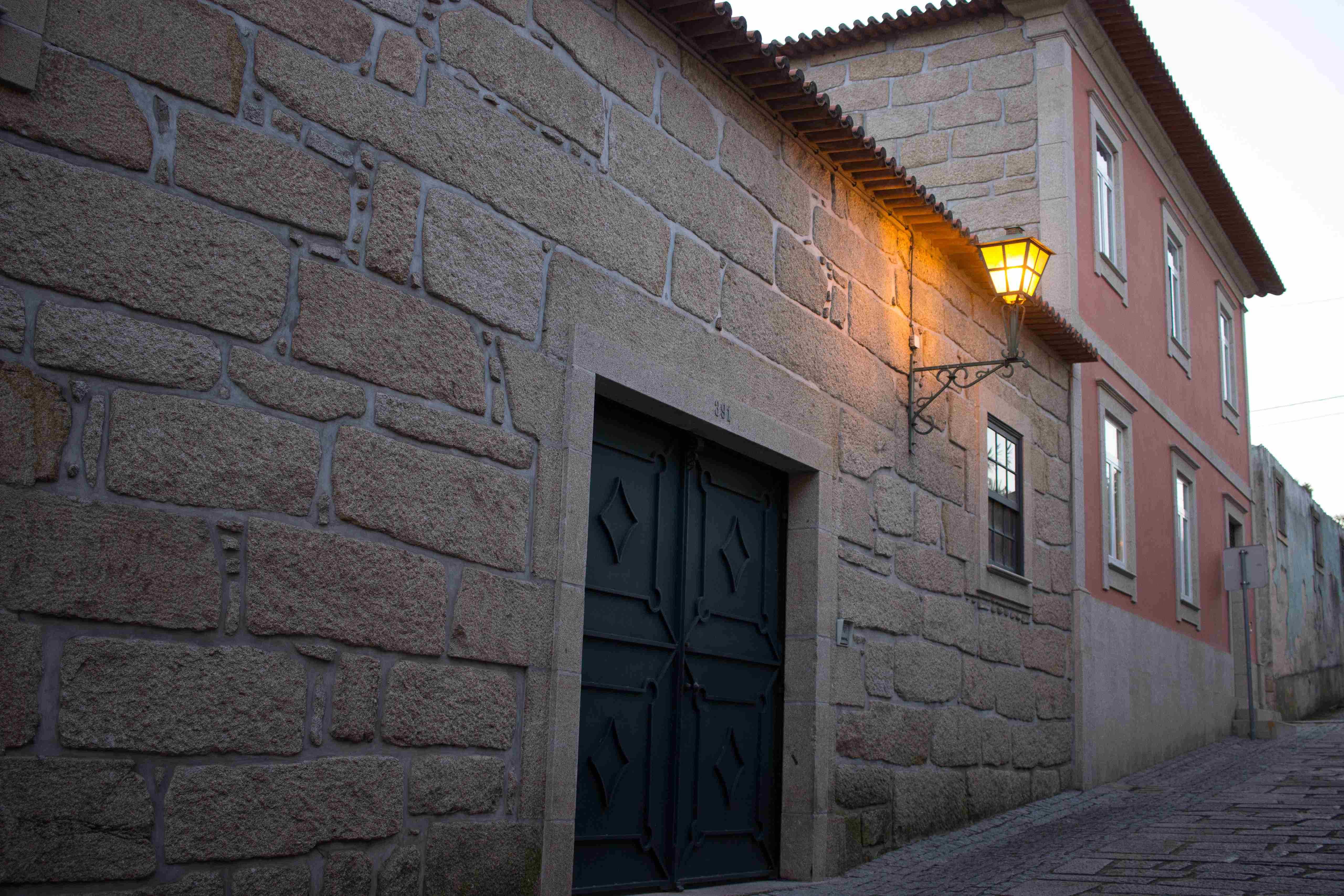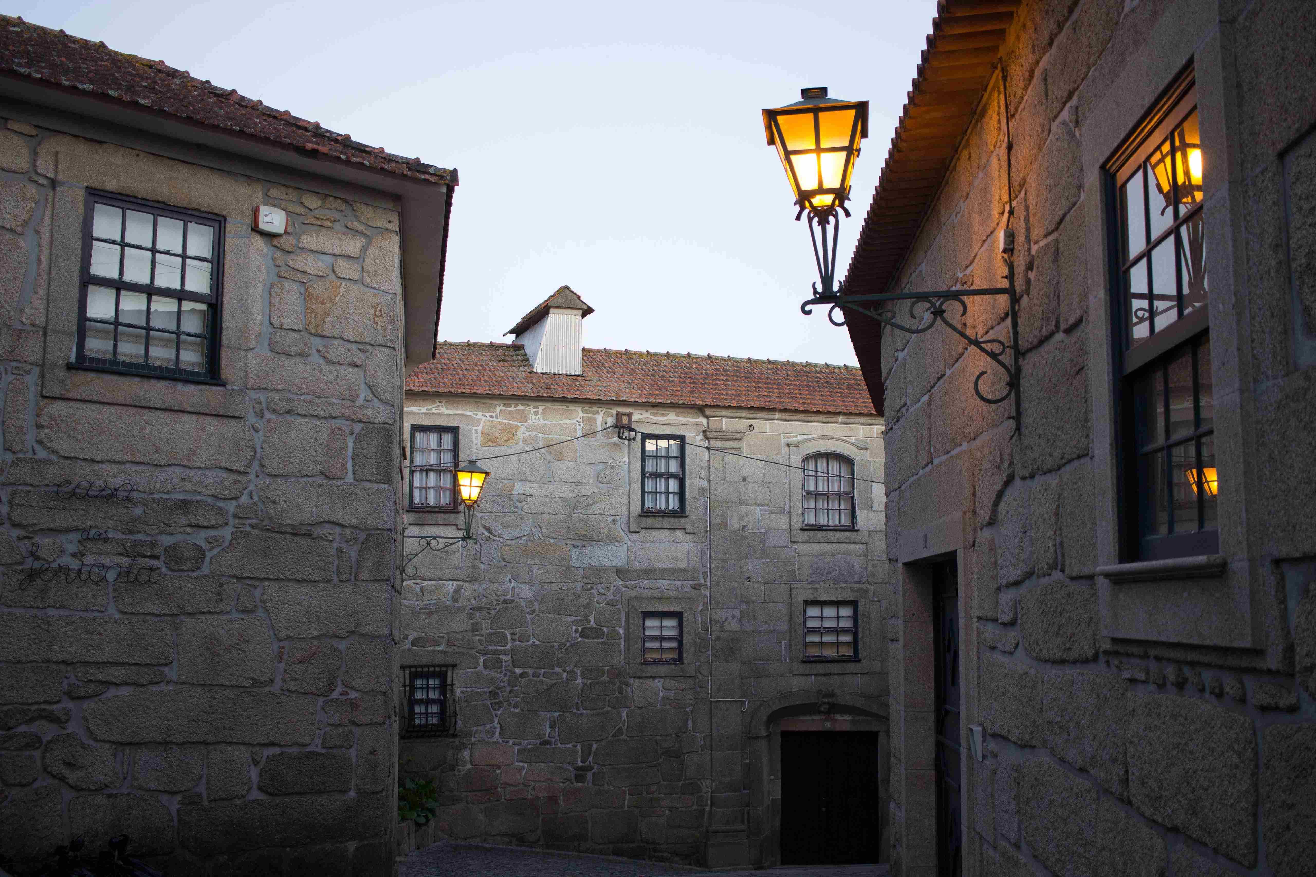 Descida pela Rua Padre Domingos Correia de Sá, com vista privilegiada para o vale do Rio Leça, seguindo pela Rua do Arco e Rua de Alvura até à Rua do Pinto.